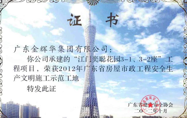 熱烈慶祝我公司“江門奕聰花園3-1、3-2座”榮獲廣東省房屋市政工程安全生產文明施工示范工地。