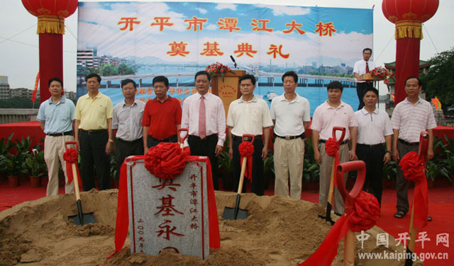 12日上午,開平市潭江大橋奠基典禮在潭江大橋北橋頭舉行,開平市常務副市長梁和平、潭江大橋改造工程項目領導小組單位領導以及項目設計單位、監理單位、施工單位代表參加了奠基典禮。潭江大橋是我市城區建設時間最早的大型橋梁之一,是往來長沙、新昌最繁忙的交通樞紐,現在的潭江大橋分兩個時期建成,前期部分建于1963年,后期部分建于1978年。經過40多年的使用,兩部分的橋梁都存在不同程度的損壞,其中前期建的橋梁