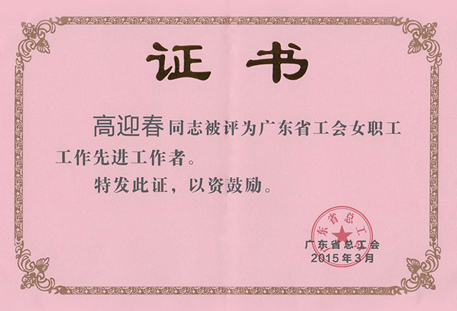 ——記我司工會副主席高迎春同志被評為廣東省工會女職工工作先進工作者近日,廣東省總工會召開了表彰2009-2014年在工會女職工組織中作出突出成績的先進集體和個人大會,我司工會副主席、女職委主任高迎春同志在會上被授予廣東省總工會“女職工工作先...