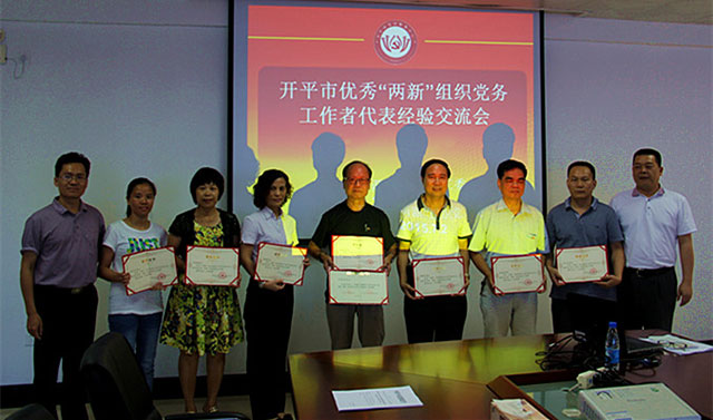 2015年7月2日,開平市組織部、開平市“兩新組織”黨工委,在開平市人民政府會議室召開了“開平市優秀‘兩新組織’黨務工作者代表經驗座談會”。會上,我司黨委書記張解矛同志作了黨建工作經驗介紹;并被獲頒“開平市優秀黨務工作者”榮譽。 我司黨委書...