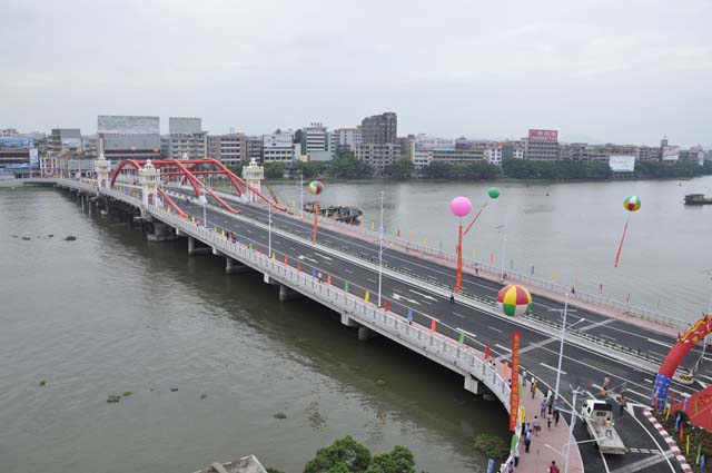 潭江大橋經(jīng)重建后全長328米,橋面寬度為31.5米,采取雙向6車道設(shè)計。全橋設(shè)計新穎,采用花崗巖欄桿,橋中主跨兩端設(shè)有四座景觀碉樓,路燈采用了風(fēng)光互補的LED路燈,裝飾燈具大部分采用LED節(jié)能設(shè)備,相信潭江大橋?qū)⒊蔀殚_平市區(qū)地標(biāo)性建筑。