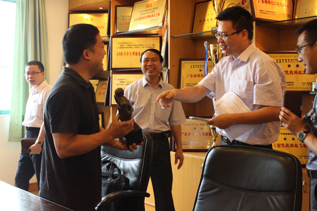圖為江門市國稅局黨委辦公室主任錢明雄對我司的企業(yè)文化表示贊同,留影紀(jì)念