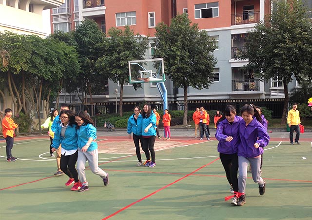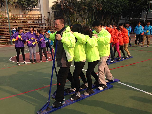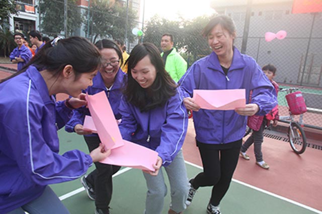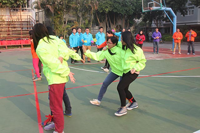 本次趣味運動會采取大學生村官和金輝華集團黨團員代表混合組隊的形式,組成4隊開展比賽。比賽項目有齊心協(xié)力、二人三足接力、搶凳仔、義氣踢毽和全心傳意。